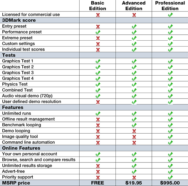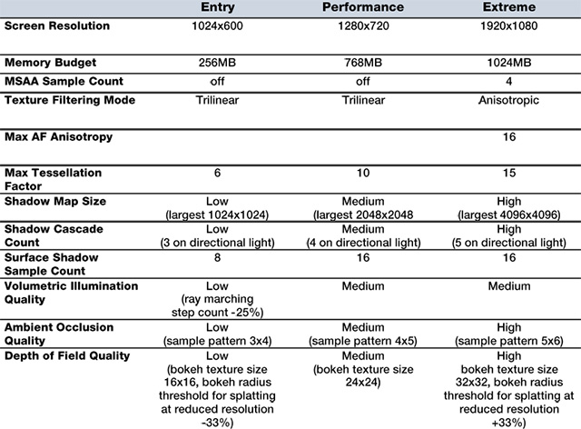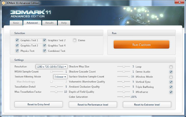 Первый предназначен для тестирования систем с DX11-совместимыми графическими ускорителями начального уровня, включая ноутбуки и нетбуки. Второй — для тестирования большинства ускорителей (хотя для достижения плавного исполнения понадобится мощная видеокарта). Наконец, экстремальный режим призван создать максимальную нагрузку на карту, он предназначен, в основном, для энтузиастов. Бесплатная версия позволяет запускать только производительный режим тестирования и не даёт возможности устанавливать собственное разрешение и прочие настройки.
