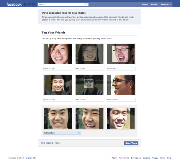 Социальная сеть Facebook сделала очередной шаг на пути улучшения своей службы хранения фотографий, сообщив на днях, что вскоре будет доступна технология распознавания лиц. Таким образом, пользователи могут при закачке фотографий связывать их со своими друзьями, просто подтверждая или корректируя определённых системой людей.Благодаря огромному кладу из пользовательских фотографий, на которых уже помечены лица людей, не говоря уже о профилях пользователей, Facebook составила огромную базу шаблонов, с помощью которых она определяет, кто указан на фото. Компания сообщает, что сегодня каждый день на Facebook закачивается 100 млн новых фотографий, при этом ежедневно также устанавливается 100 млн пометок. Пометки — важное отличие фотослужбы Facebook, которая была на момент запуска не очень удобной по сравнению с конкурентами. Но возможность добавлять аннотации и отмечать друзей на снимках сделала значительный толчок вперёд для Facebook Photos. Новые средства автоматического распознавания лиц должны позволить значительно упростить для пользователей управление пометками. Технология отчасти разработана самой Facebook, а отчасти лицензирована (имена других компаний, участвовавших в разработке, не называются). Автоматическое распознавание лиц можно будет включать или отключать.