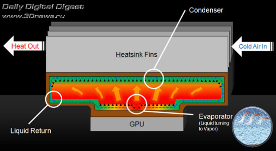 Ответственным за отвод тепла от чипа GF110 и других компонентов GTX 570 является «двухэтажный» кулер активного типа, у которого вместо тепловых трубок применена испарительная камера.