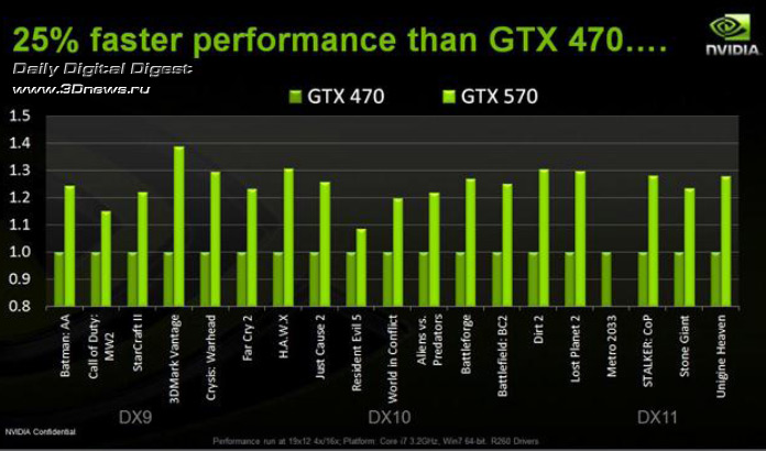 В своем обзоре героя текущей заметки компания NVIDIA сравнивает производительность GeForce GTX 570 с GTX 470 и говорит о 25% преимуществе первого.GeForce GTX 570 против GTX 470
