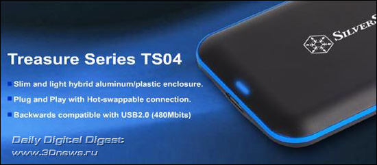 На официальном сайте компании SilverStone Technology появилось описание компактного бокса Treasure TS04 (код SST-TS04), предназначенного для размещения одного 2,5-дюймового винчестера либо твердотельного диска с SATA-интерфейсом. Новинка отличается очень привлекательным внешним видом, предлагается в чёрном исполнении с голубыми акцентами, изготовлена из алюминия и пластика, обладает габаритами 136 x 84,5 x 16,3 мм и весит 60 г. Подключение к компьютеру, управляемому операционной системой Windows XP/Vista/7, Mac OS или Linux, осуществляется по высокоскоростной шине USB 3.0.Теперь осталось выяснить, где, когда и по какой цене данную модель можно будет приобрести.