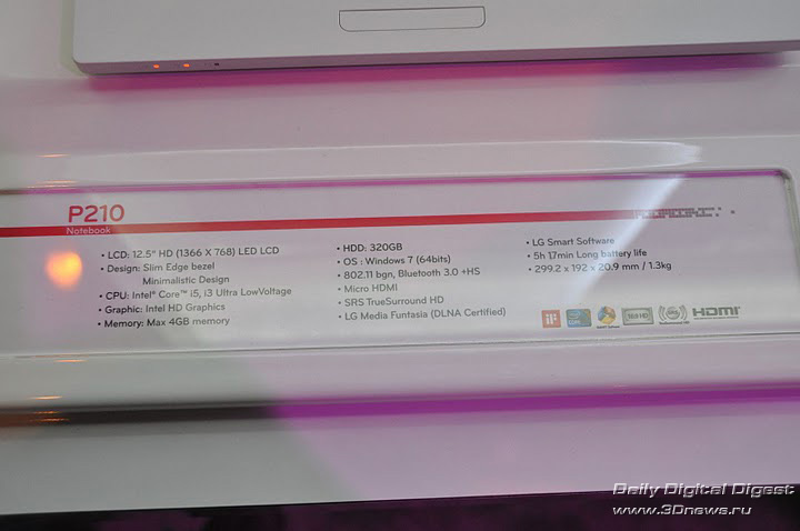 Во время CES в Лос-Анжелесе компания LG показала свой новый тонкий ноутбук P210, основанный на энергоэффективной платформе Intel Core i3 или i5 Ultra LowVoltage со встроенной графикой. Ноутбук выглядит довольно стильно и строго и оснащается бесщелевой клавиатурой. Устройство имеет небольшой 12,5-дюймовый HD-экран с разрешением 1366×768 точек и светодиодной подсветкой. Объём жёсткого диска достигает 320 Гбайт, а оперативной памяти — 4 Гбайт. Стоит упомянуть о наличии выхода micro HDMI, а также беспроводных соединений Wi-Fi 802.11 b/g/n и Bluetooth 3.0 +HS.